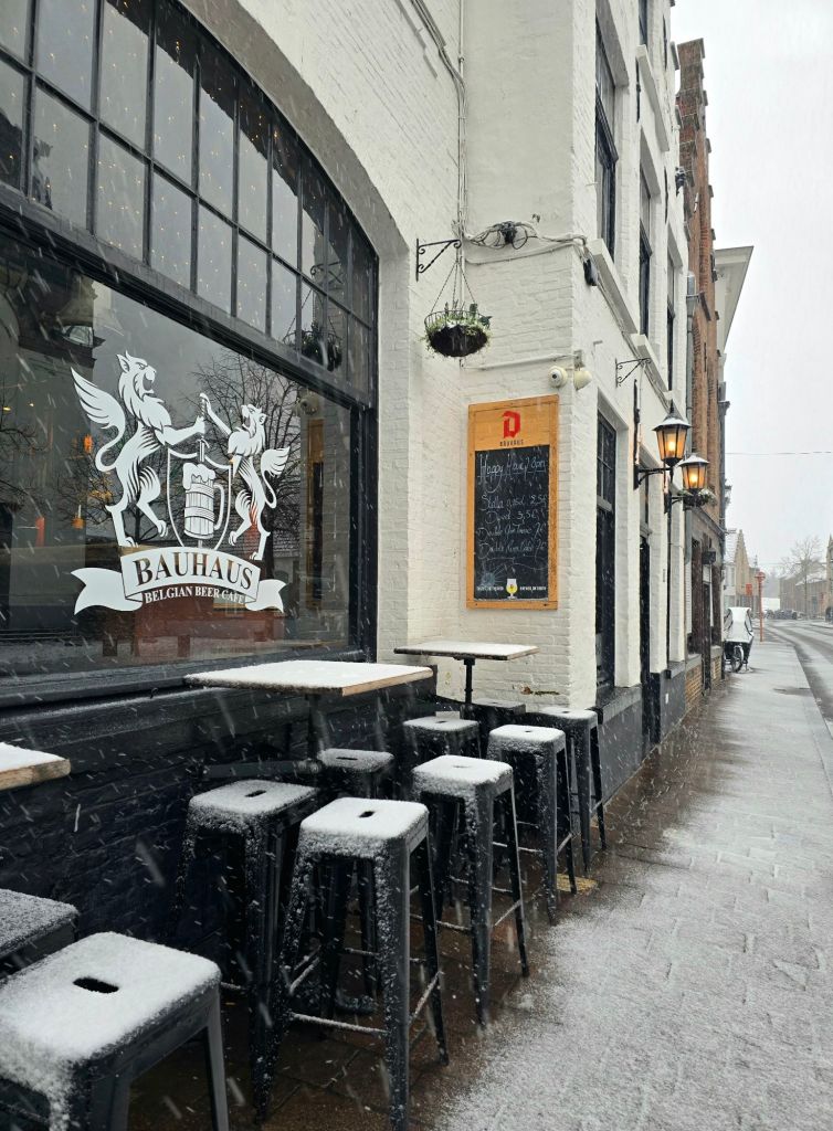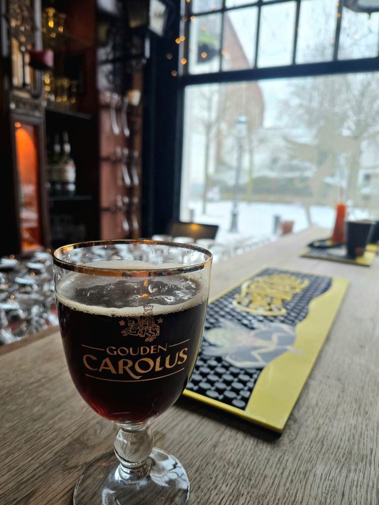 I decided to start my Belgian journey in Bruges… I just had a feeling that I would love it there and would prefer it to Brussels. And I’m so glad I did… It was supposed to snow the afternoon I arrived, and it held off JUST long enough for me to arrive to the hostel. By the time I checked in and made my way to my first beer, it was snowing pretty heavily and was accumulating rapidly. The streets were turning from cobblestone to snow right before my eyes. I ordered my first Belgian beer, a Carouls Classic, after taking the suggestion of the bartender. I wanted a darker beer to warm me up before going for a snowy walk around the city. Success!