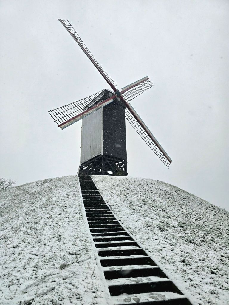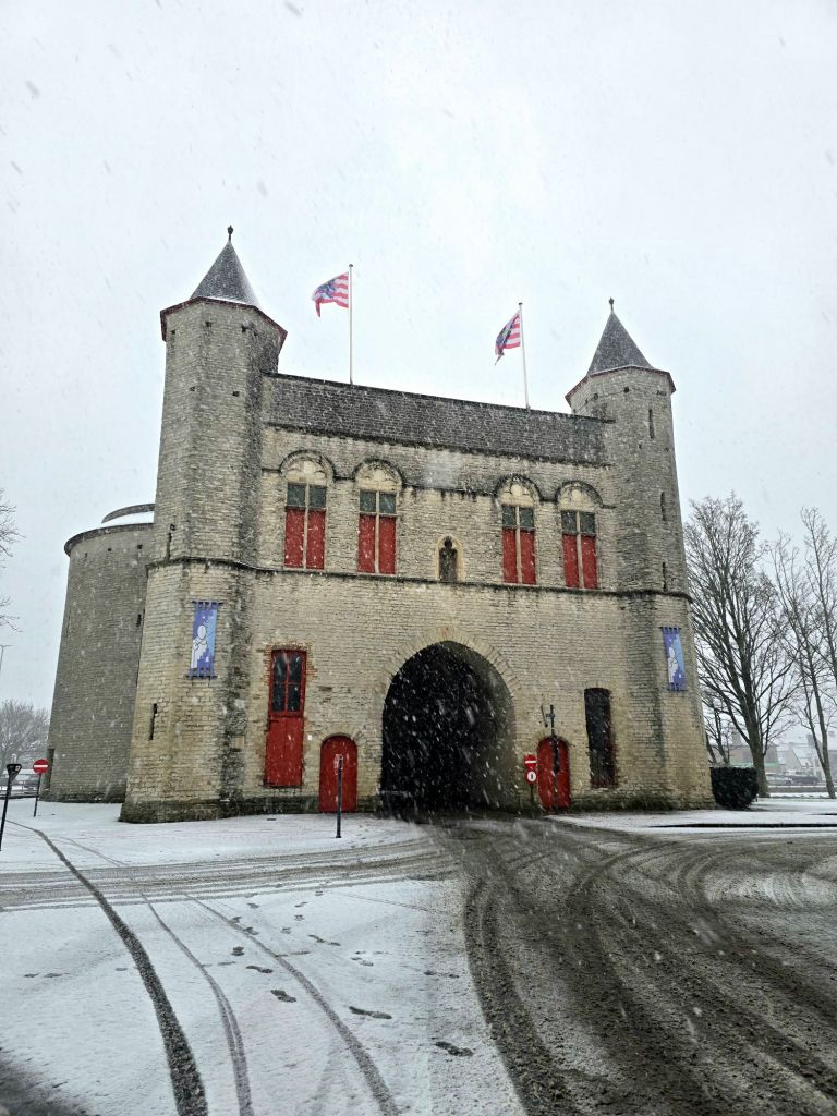 It did the trick, and I was off! First up: two large windmills situated alongside the river and a big city gate. While I was enjoying the snowy walk, many people were out sledding down the big hills the windmills were built on. I wasn’t going to wander too far due to the cold and wet, but I should know myself better by now… Once I’m out exploring, there’s no stopping me. 🤣 I ended up meandering all the way to the town center. There weren’t many people out and it was so lovely to stroll through the snowy streets and parks.