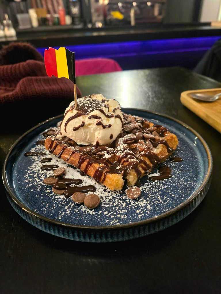Back at the hostel, I rested a bit again, before making myself get up for one last night in Belgium. I still had to go check out the Delirium Cafe (a renowned bar) and grab dinner. But beer first. This place had so many options to choose from, but I went with my gut and chose a strong blond by Delirium. It was quite tasty, but not as good as the very first beer I had, Carouls Classic. So, I order that next. And then I decide I must sample the Trappist beer one last time, so I order the Westmalle. And then… no, no more beer 🤣. It was time for dinner. Which ended up being a… drumroll please… a raspberry waffle! This was by far my favorite. It wasn’t covered in raspberry sauce or raspberries, but the batter itself had raspberries in it. I should’ve ordered 5 of those things!