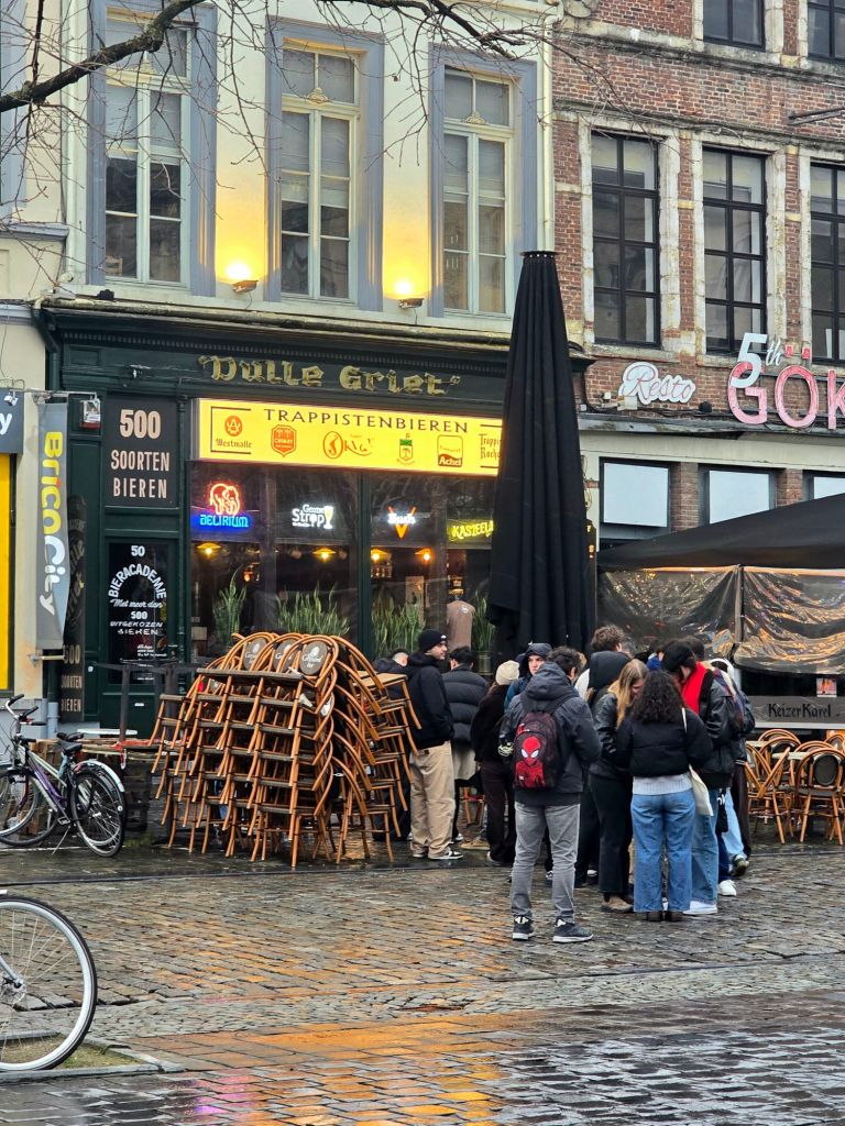 I arrived just as they opened and tried a blonde, and then it started pouring rain, so I sampled two of the others. 😅 They were very good, but I couldn’t tell they were any different than “hopped” beer. I stayed here a while, working on the blog and waiting until the next bar opened: The Dulle Griet. I’d seen this on IG, and knew I had to give it a go.