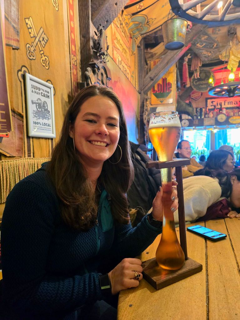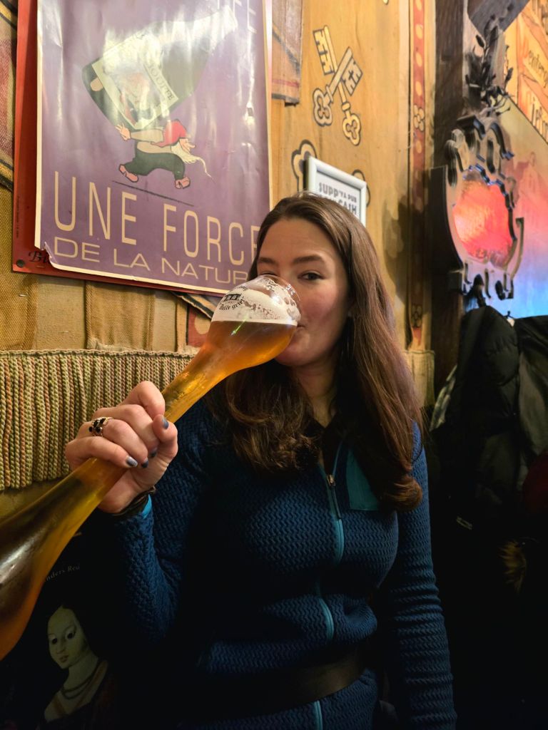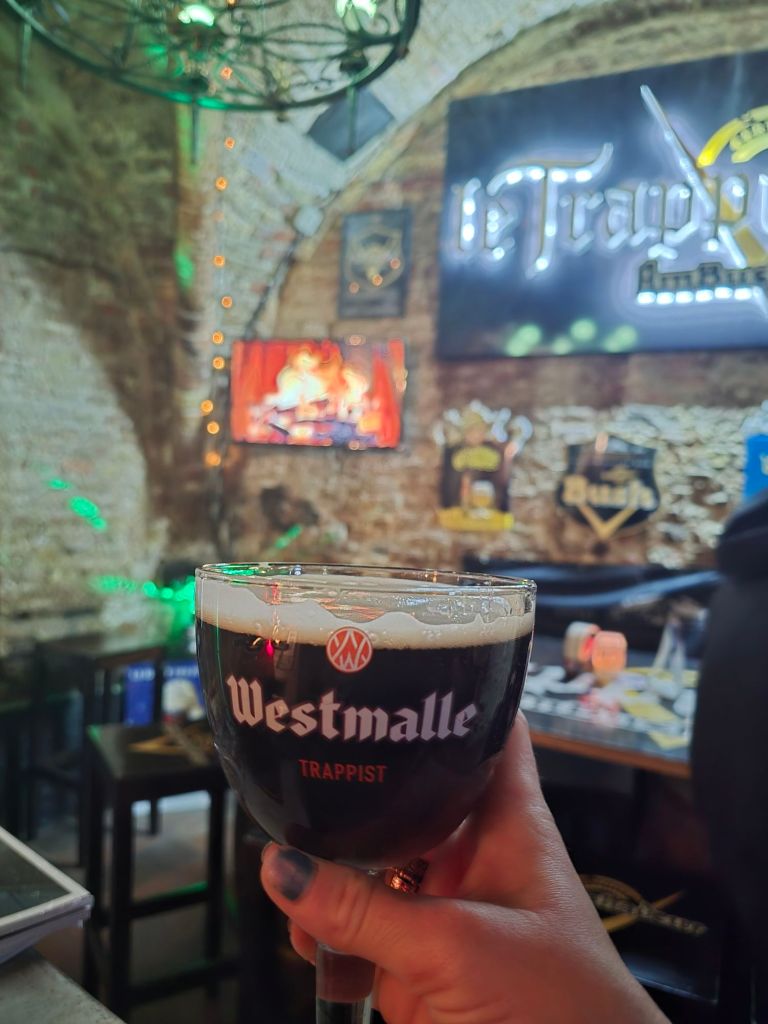 The fun thing about this bar is they serve a beer in a 1.2 liter glass! Yikes! And as collateral for the glass, they take one of your shoes and string it up in a basket hanging from the ceiling. 🤣 I HAD to do this. A lot of people in there were ordering that one, and I’m sure that has made this bar a tourist hit. I don’t even want to imagine what this place looks like in the high season. I was asking the Belgian for more beer recommendations, as there are just so many to choose from. He told me to definitely try the Westmalle Trappist, and he ordered another one I was curious about, Gulden Draak, or Golden Dragon, and I can see where it gets its name. After the lighter, but 1.2 liters of the other beer, the second beer packed a punch. 😅