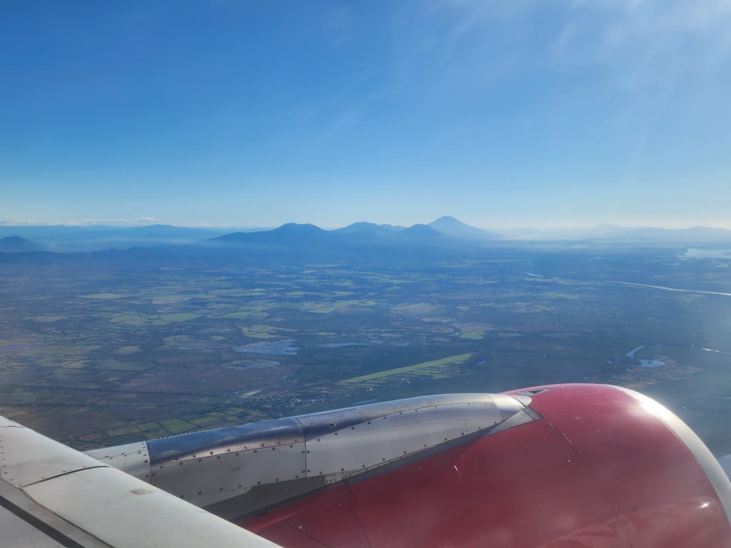 They start to make announcements for boarding, and we’re told we need to wear masks for the boarding process. Did we just hear that right? Did we overlook something and covid restrictions are in full effect there? Uh-oh. Dana saves the day though, by having some extra masks readily available, so I snag one, and we board the plane. Window seat again! Wooohoo!