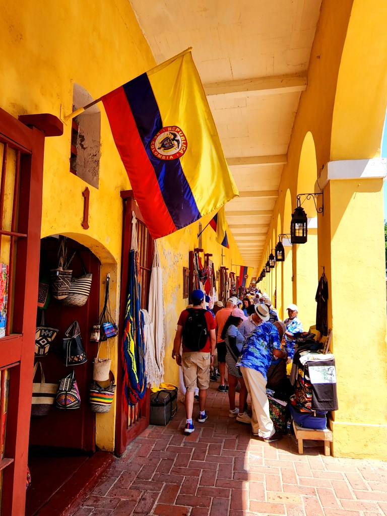 We arrive there, and we spot our dreaded enemy: the cruise ship busses. Oh no. This place is packed like sardines! But, it’s a neat building, and Dana requires a Colombia patch. We muster what little strength and gumption we have left and begin our search. The first store we went to, we found a super cool and unique patch! Hooray! But, Hayden suggests we look at some other stores before deciding on which patch to buy. Dana is up to going to 3 more shops, but by the time we were leaving the 3rd shop, we were committed, lol. We walked the whole length and went inside nearly every souvenir shop that looked like it might have a patch. At the end, we all felt that the first patch was THE patch.