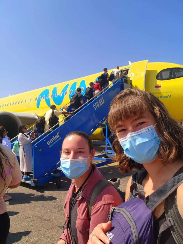 Soon we hear the announcement that we’re about to land! Ooooo! We’re getting so close! I can’t wait! Everything looks hazy, and it’s hard to make out the city, but it almost looks like Miami…lots of tall white condo or apartment buildings, I’m guessing. The pilot told us it was a warm 92 degrees….yikes! Haha So far you know we traveled south from El Salvador to San José, and we’re landing somewhere that maybe sort of looks like Miami Beach. Where are we? 🧐🤔😍