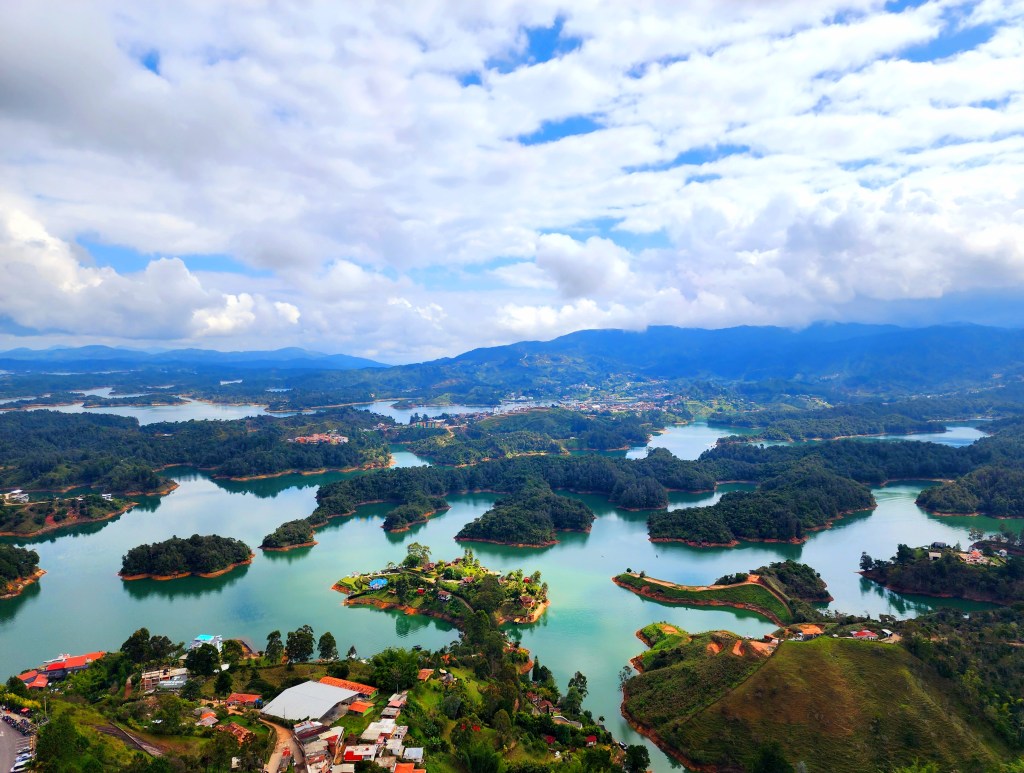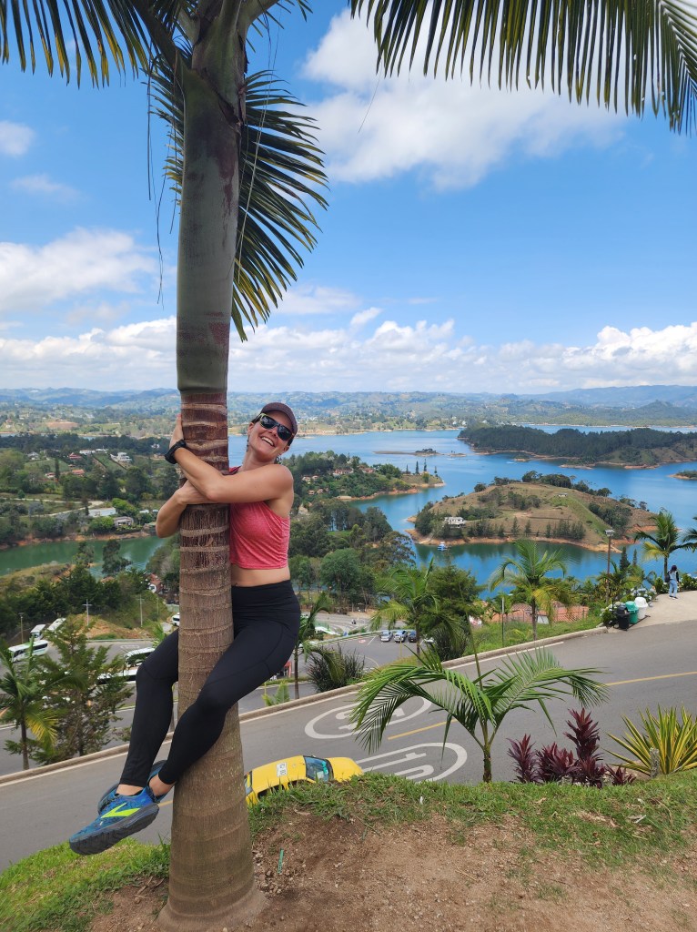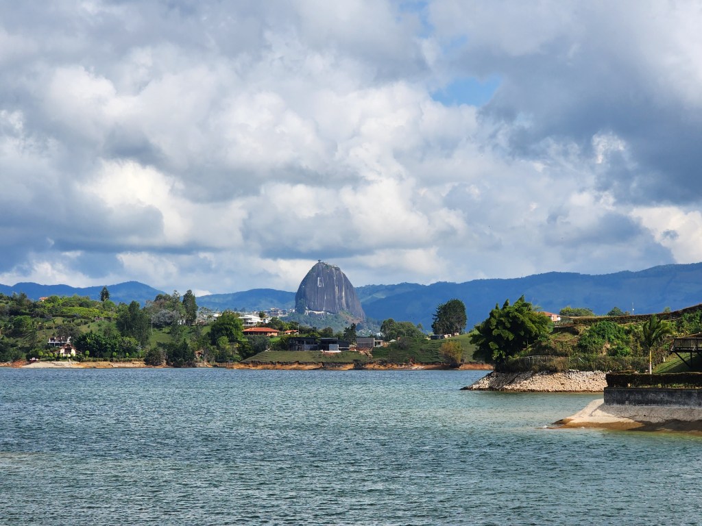 This morning, we made our way to the main park in El Poblado to catch our day tour to Guatapé. The big attraction here is an enormous rock protruding from the earth, which has a whopping 700 stairs to climb in order to get to the top. I thought we were done hiking? Haha. Never. We’re never done hiking, as there is always a hike to be done. And it’s always worth it! :). It’s a 2 hour drive from Medellín to where we will be stopping for breakfast. We had a traditional breakfast with scrambled eggs, an arepa, a portion of cheese, a piece of toast, and hot chocolate. Perfect fuel for the 700 stair climb that awaits us….right? Lol.