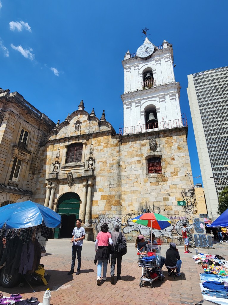 We finish the walking tour by visiting one of the oldest churches in Bogotá, Nuestra Señora de La Candelaria. It was really cool! The roof was covered in wooden beams, and the walls were covered with ornate stations of the cross, I believe. There was one section that was gated off but glistened as if they were real gold accents in there. I imagine it’s real gold, and maybe at some point, all of these stations of the cross were adorned with gold. It makes me think of the history of Latin America, and how the Spaniards and other colonial powers came and scoured the earth for precious metals, taking them back to their own countries, or using them for their churches. On the one hand, the building is wildly beautiful, but on the other hand, it’s a representation of colonialism at its worst. I’ve always struggled with that contrast, and I think I always will.