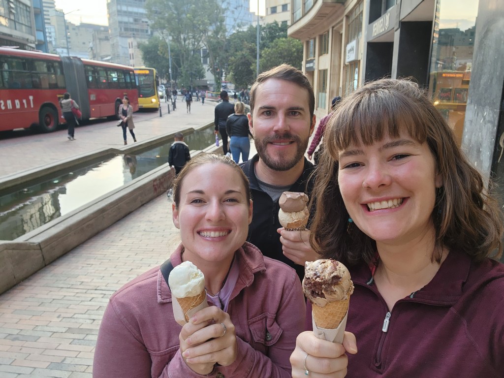Feeling grateful and now sufficiently full, we head out for one last helado (ice-cream) together. We make our selections, and with our cones in our hands, we walked around the little park that is directly in front of our apartment building, taking in the last views of Bogotá and Colombia. Such a bittersweet moment. I’m so grateful to have had this opportunity, but I am sad to leave it behind. I’m going home to fun things, and there will always be a new adventure waiting, but closing a chapter and saying goodbye is always tough.